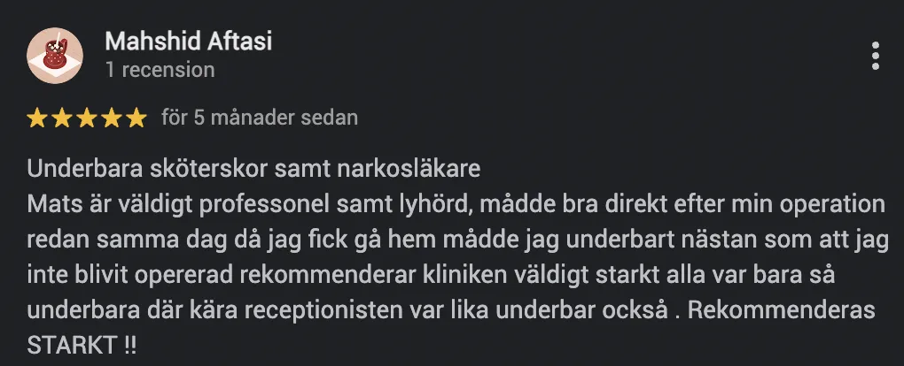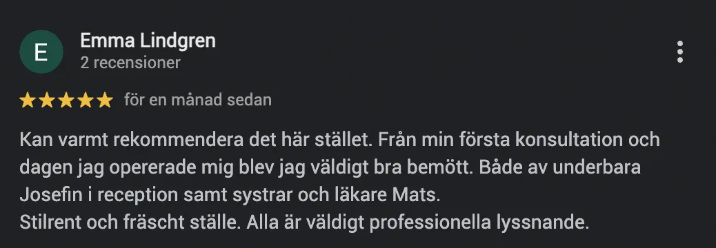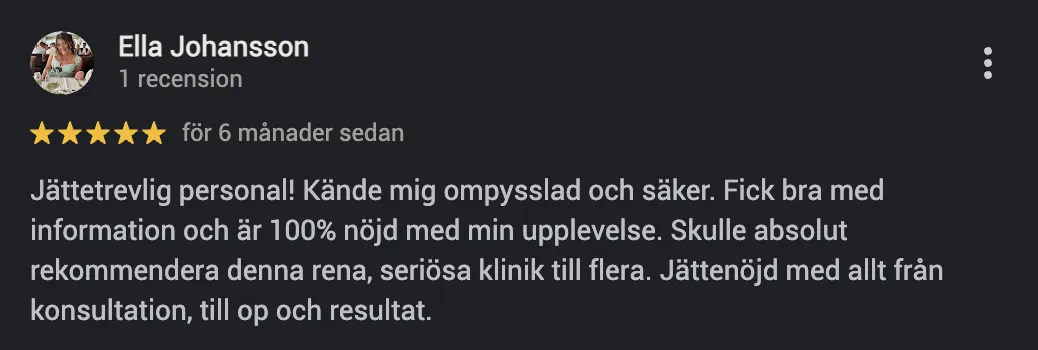 Vi kommer även att gå igenom vilken behandlingsplan som passar bäst för just dig och dina individuella förutsättningar. Du har möjlighet att ställa alla dina frågor, och vi går igenom vad du kan förvänta dig för resultat utifrån dina behov. Dessutom diskuterar vi priset, betalningsalternativ och eventuella operationsdatum om det är aktuellt.